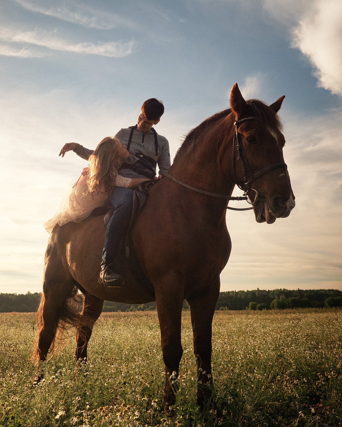 Одна из самых волнительных и запоминающихся моих работ. Еще накануне я специально съездил в предполагаемую локацию на разведку, посмотрел поле, с какой стороны восходит и заходи солнце. Подметил интересные ракурсы и фон. В моей разведке был только один просчет, я не подметил устроенную росу из-за которой я был весь мокрый с головы до пят, в кроссовках хлюпала вода. Лишь после съемки я заметил все эти неудобства. Настолько было увлекательно. В процессе съемки пришла идея почему бы не сделать несколько коротких видео и нарезать потом видеоролик, чтобы маме девочки было приятно.